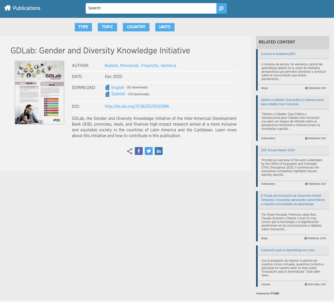 Acutely aware of the importance of providing internal personnel and external researchers relevant resources and research, the IDB created FindIt. FindIt is a semantic search platform that in response to search requests, contextualizes and suggests relevant information from the IDB’s universe of knowledge.