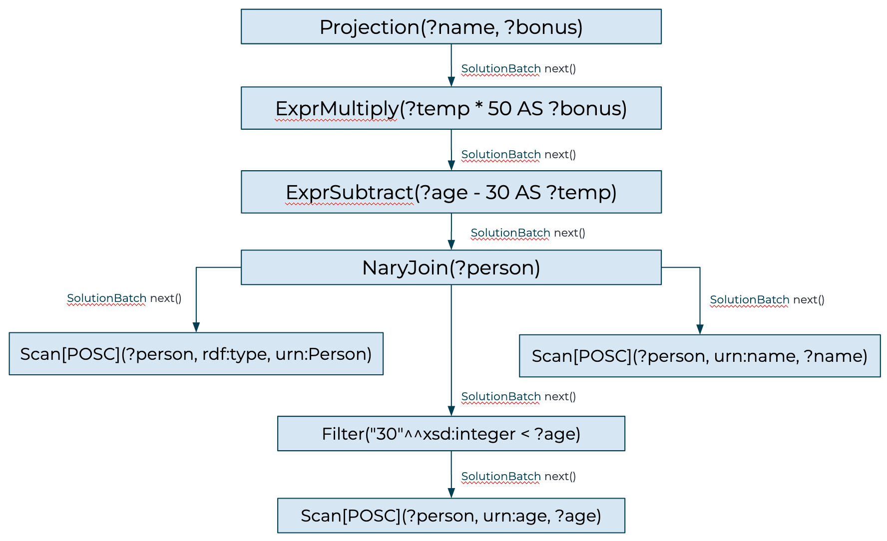 The API between the operators now also changed to account for the solution batches. Each operator now pulls a SolutionBatch from its child operators.