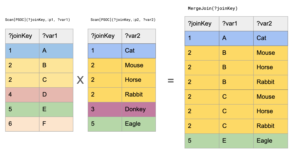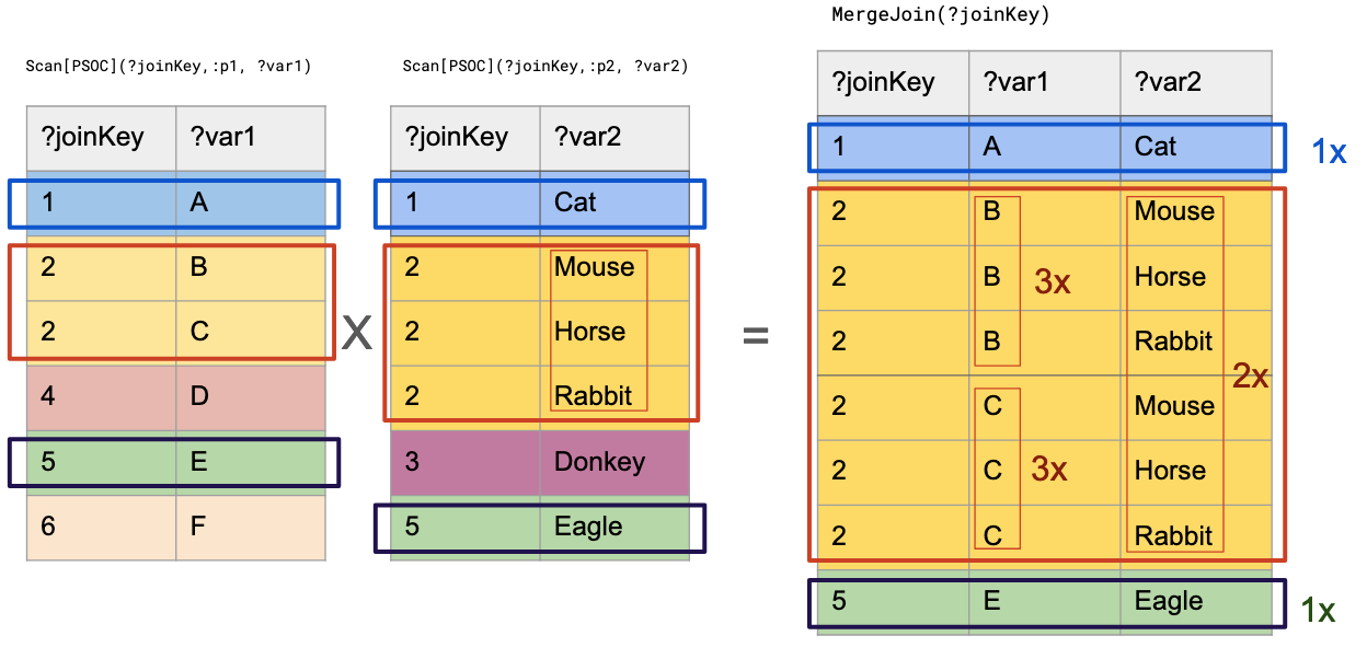 The graphic should illustrate what happens here. We see how in the final cross phase the group of the join key value “2” is build: Each row of the left side (just “?var1” here) is expanded three times, and the whole range the right side (just “?var2” here) is repeated twice.