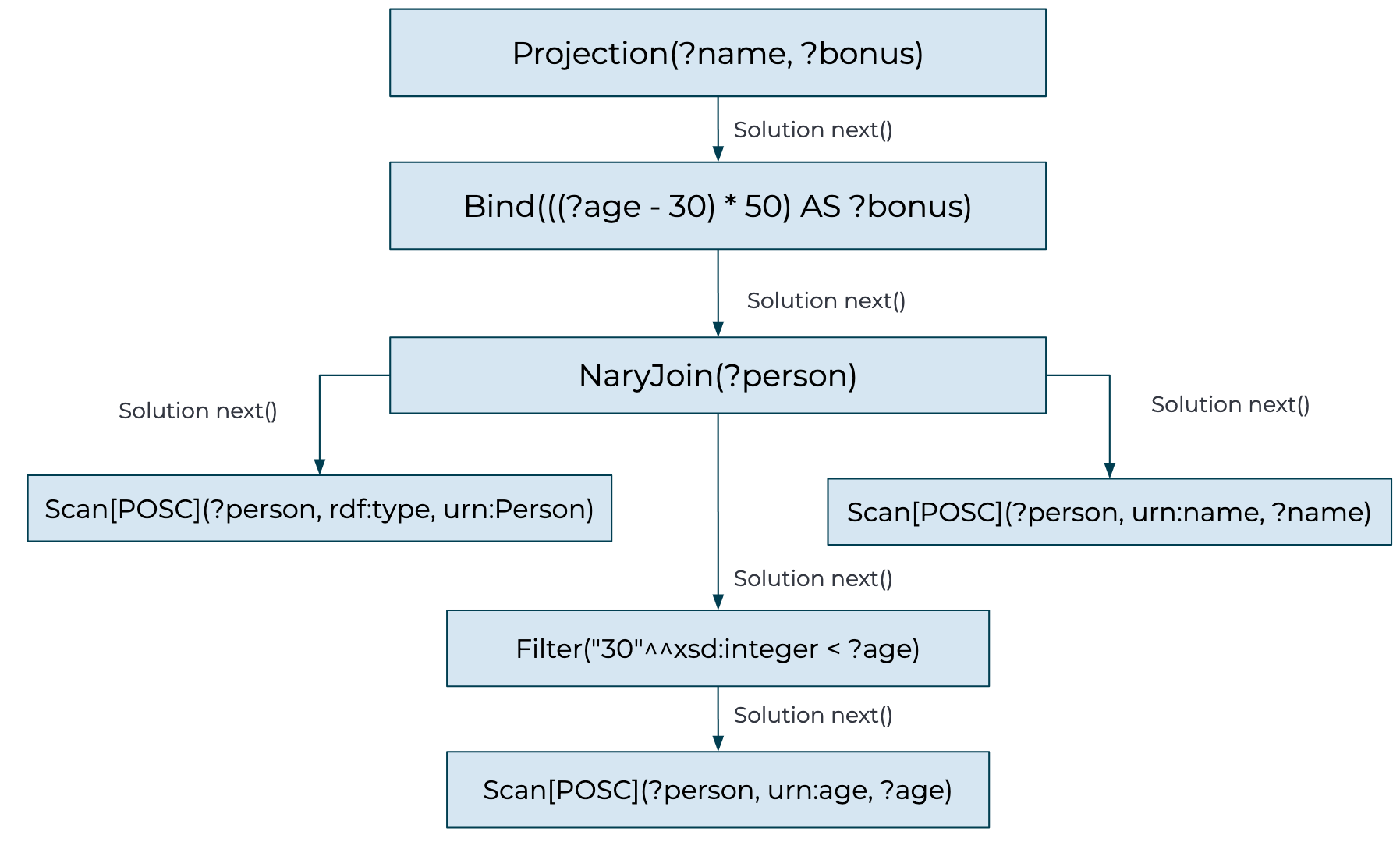 The query would be translated into the following executable operator tree. Note how the expression (?age - 30) * 50is evaluated by a the Bind operator.
