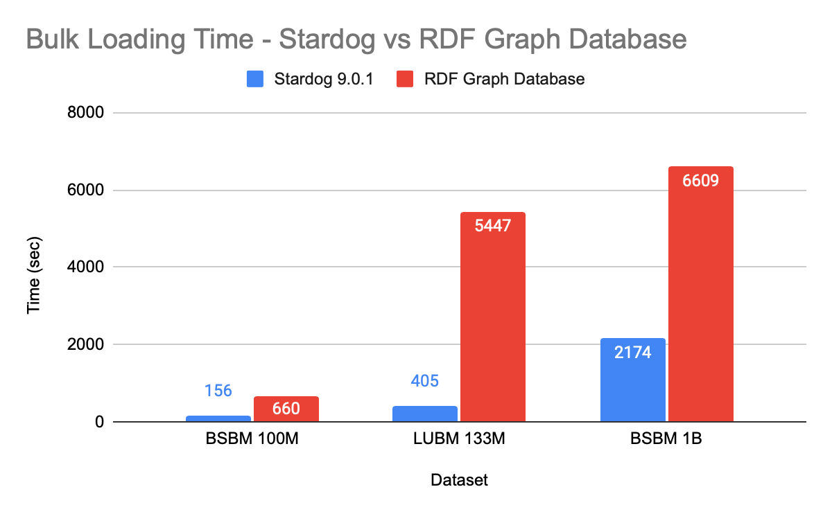 Comparing the loading times of Stardog and the Commercial RDF Graph Database on r5.2xlarge instances with identical memory settings, Stardog is 3 to 4 times faster loading the BSBM dataset and more than 10 times faster for the LUBM dataset: