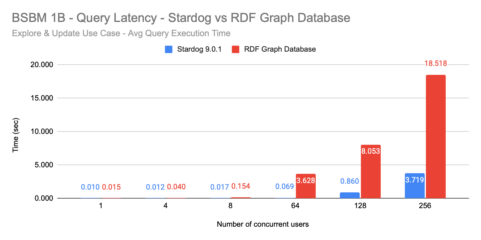 Our results were an average query execution time ranging from only 10 milliseconds with a single user to 69 milliseconds with 64 concurrent users. On the same hardware, the Commercial RDF Graph Database we compared ourselves against took 50 percent longer for a single user at 15 milliseconds, and the gap widened from there, with a 3.628-second response when there were 64 concurrent users. That’s a 50x difference: