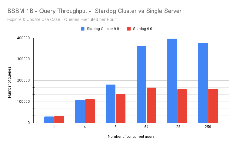 A three-node Stardog cluster improves query latency 8 to 10 times compared with a single Stardog endpoint at high levels of user concurrency. Query throughput is improved by 2.5 times with the three-node cluster: