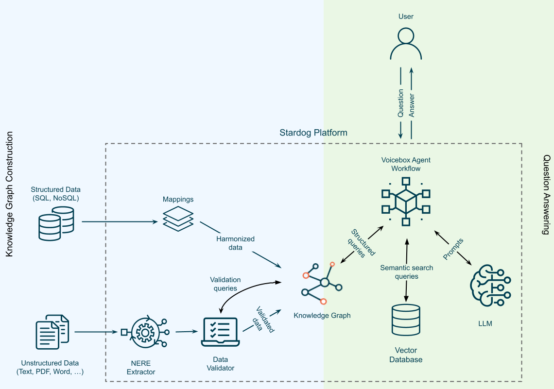 Structured data sources can be SQL or NoSQL databases and Voicebox’s automation services map them to a unified and harmonized graph data model. Stardog Designer also uses Voicebox to customize graph data models based on Knowledge Packs that we’ve developed for key use cases in targeted verticals, largely in partnership with Accenture and other alliance partners. Voicebox helps to semi-automate this process where users can verify mappings generated by Voicebox.