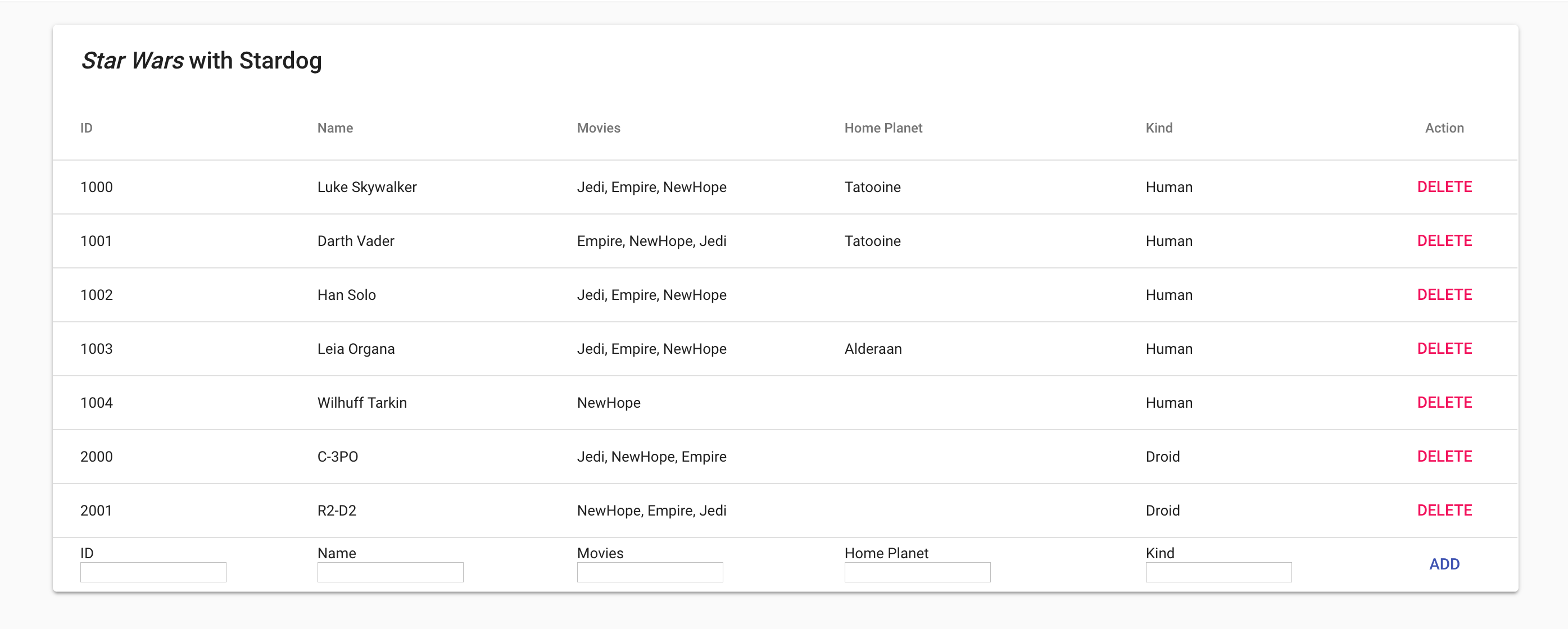 If you return to the browser and click on the “DELETE” button for Anakin, you should see his entry removed from the table. Again, if you’d like to confirm that this operation really changed the data in Stardog, feel free to refresh the application.