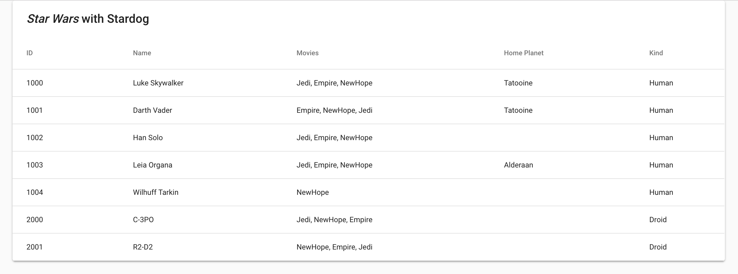 Stardog isn’t only for Java developers, command-line gurus, and database engineers. In this post, we’ll see how easy it is to build a web app–an editable catalog of Star Wars characters–with Stardog, using some of the latest and greatest front-end tools, including React, ES2015+, yarn, Node.js, and stardog.js.