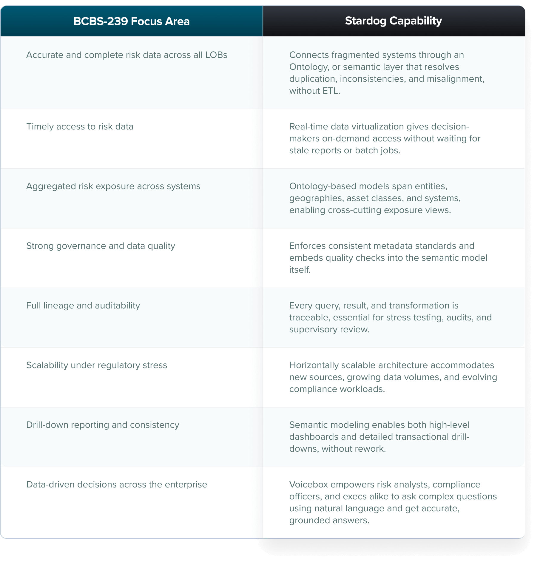 Specifically to BCBS-239 mandates, here is how the Stardog platform aligns to key focus areas: