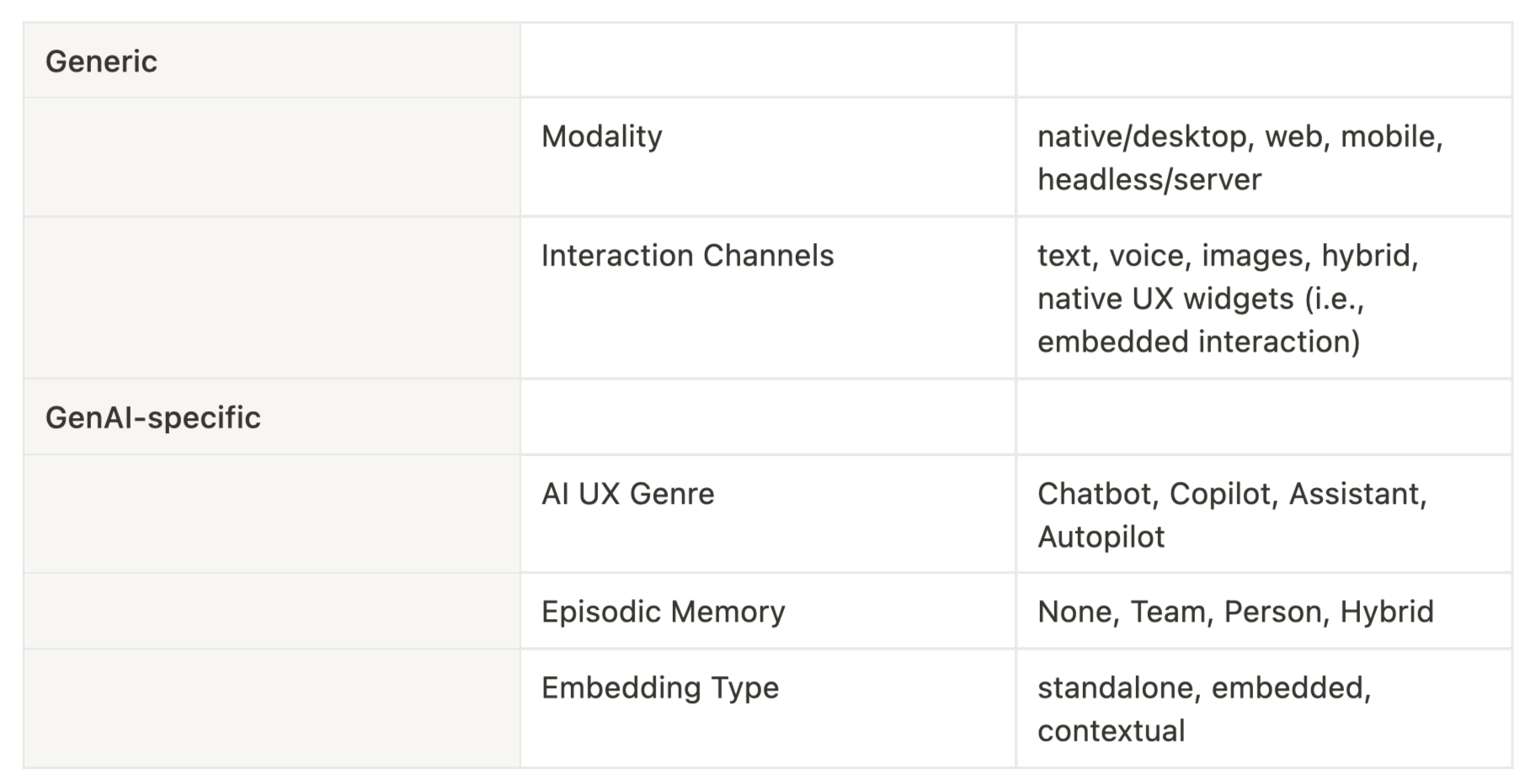 A GenAI app is…an app, which means it has a UI and, thus, a UX. What are the primary design considerations for the UX of a GenAI app? Well there are a few types, including: