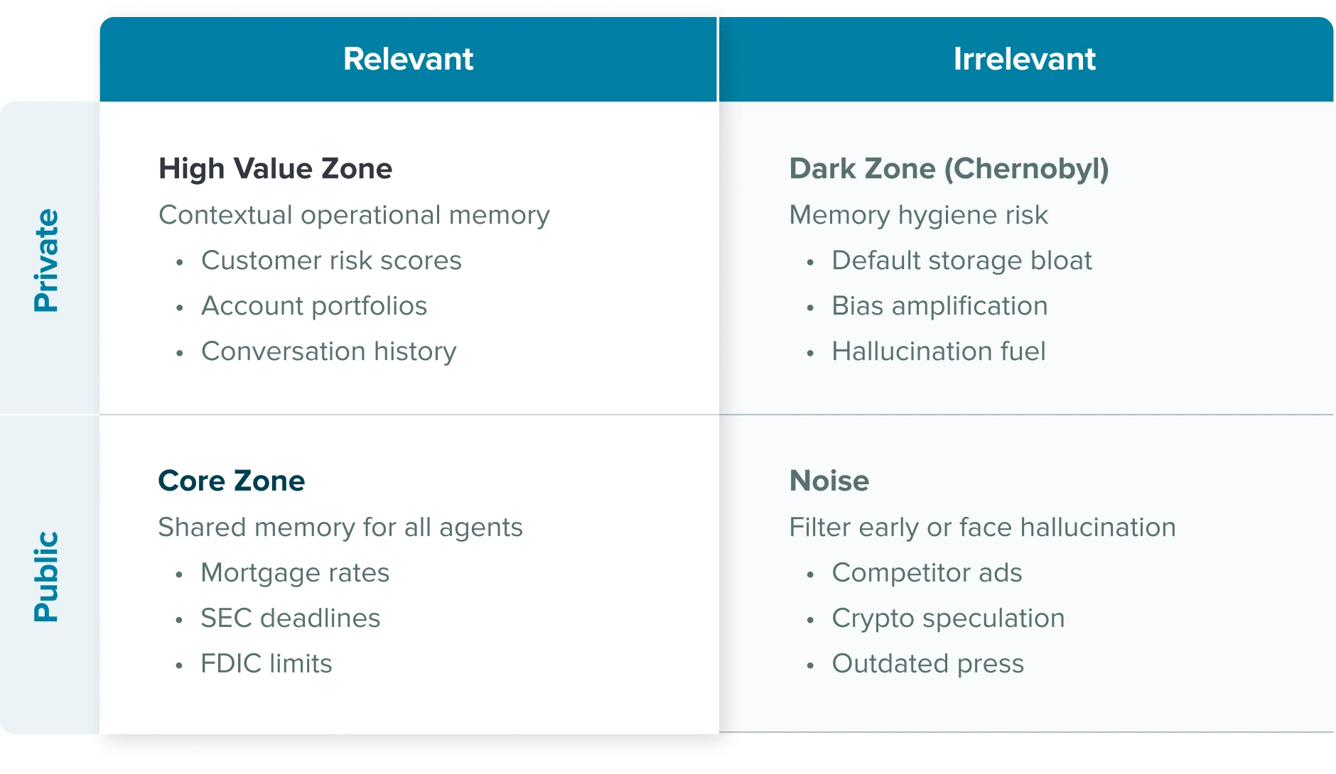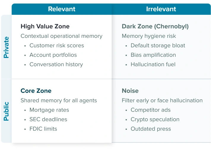 Private + Irrelevant (Chernobyl): The danger zone where storage bloat becomes memory hygiene risk. This is where hallucinations and bias creep in through accumulated organizational noise. Often stored by default, desperately needs purging, compression, or intelligent tagging.